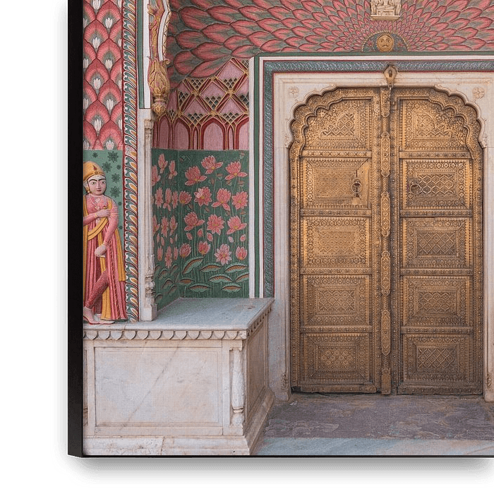 Une belle et ancienne porte en bois, avec beaucoup de couleurs. J'ai pris cette photo au City Palace de Jaipur.