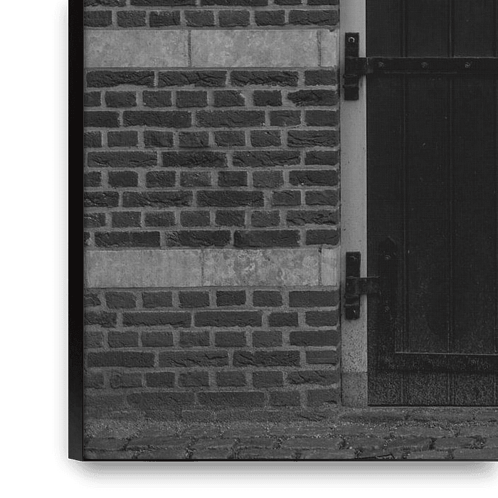 Photographie en noir et blanc de la porte au bas du moulin à Haarlem. Ce moulin est situé directement au bord de l'eau du Spaarne et est appelé le Moulin d'Adriaan. Photographié par la photographe de voyage Sanne Dost.