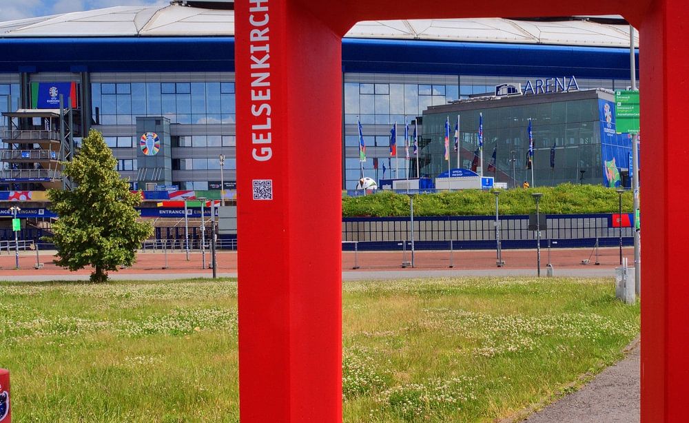 Action artistique dans le cadre de l'Euro 2024 de football à Gelsenkirchen avec des buts rouges. Ici, devant la Veltins Arena.