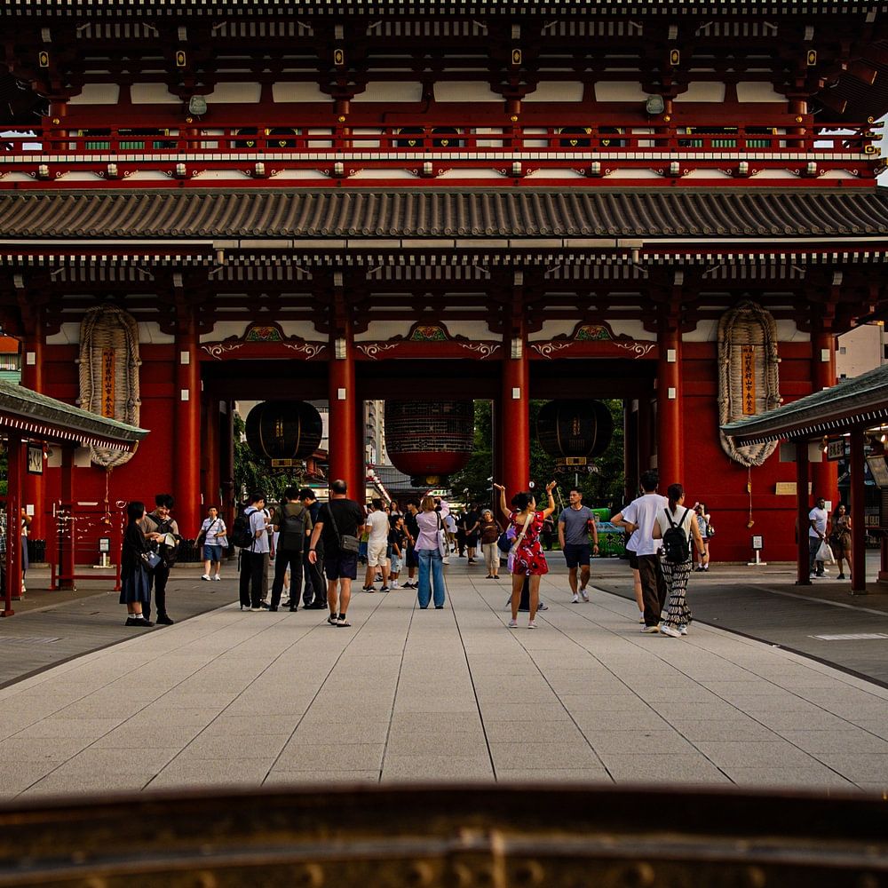 Devant un bol d'encens cérémoniel japonais avec de la poussière, on voit la porte du dieu du tonnerre avec un énorme lampion à Asakusa (quartier de Tokyo). Le jeu d'ombre et de lumière et les couleurs rouges vives me plaisent particulièrement dans cette image.