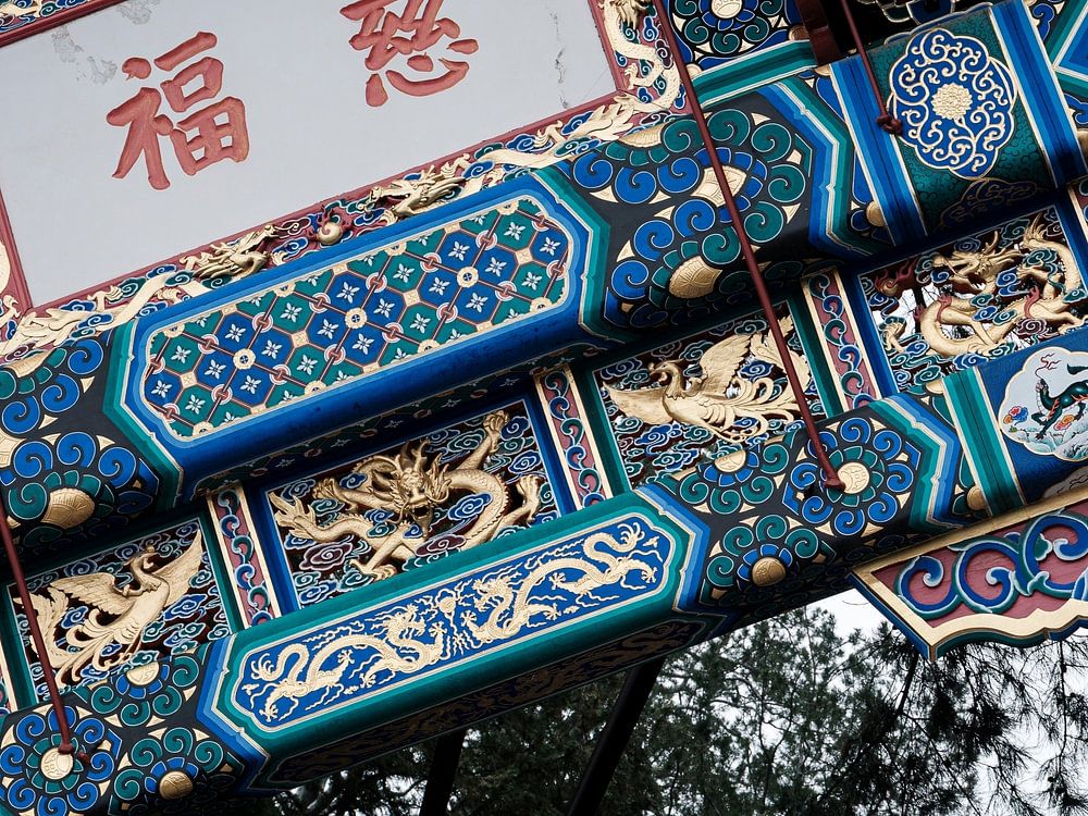 Porte en bois magnifiquement peinte du Palais d'été de Pékin.