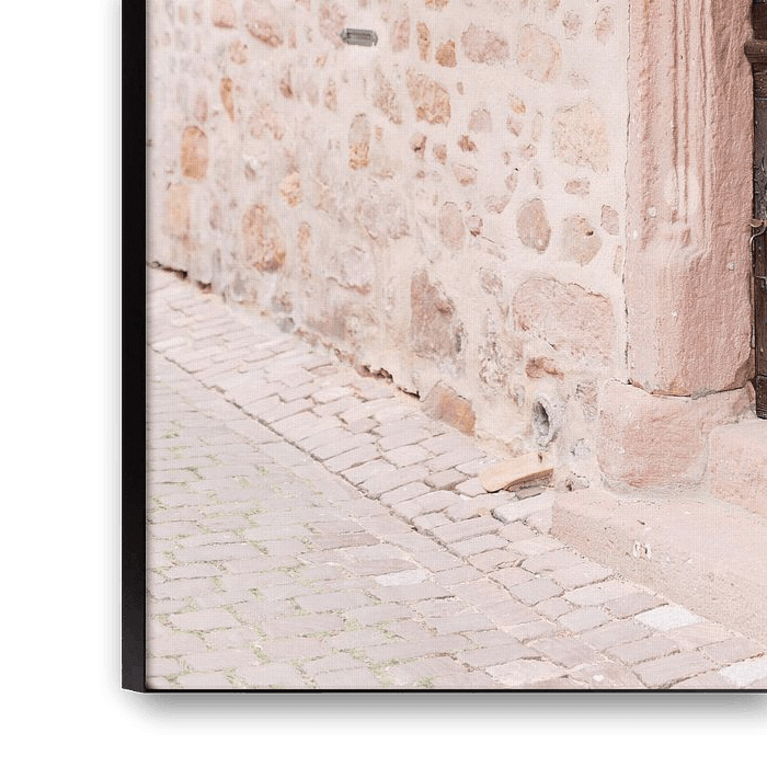 Vous trouverez la rue avec ce mur de pierre rose avec porte en bois et végétation dans le vieux village de Riquewihr, en Alsace.