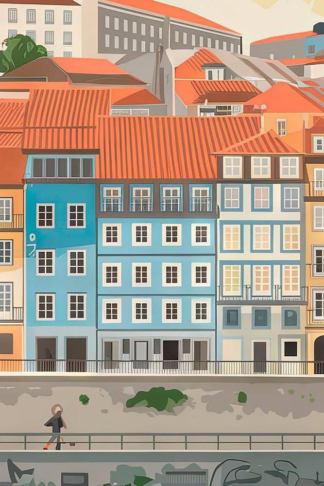 Les façades colorées s'harmonisent avec la douceur de la côte, tandis que les toits orangés forment un charmant contraste avec la façade bleue des bâtiments. De doux nuages passent au-dessus de la ligne d'horizon expressive de la charmante ville de Porto, qui raconte son histoire dans chaque mur et reflète l'âme de la côte portugaise. Un lieu plein de vie et de couleurs !