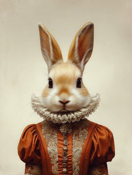 Sur ce portrait particulier, vous voyez un lapin qui regarde droit devant lui avec dignité. L'animal porte une robe riche et classique dans des tons chauds rouge-brun. Le tissu semble épais et élégant, avec des détails raffinés et des boutons gracieux sur la poitrine. Autour du cou, le lapin porte un col blanc finement plissé, qui lui…