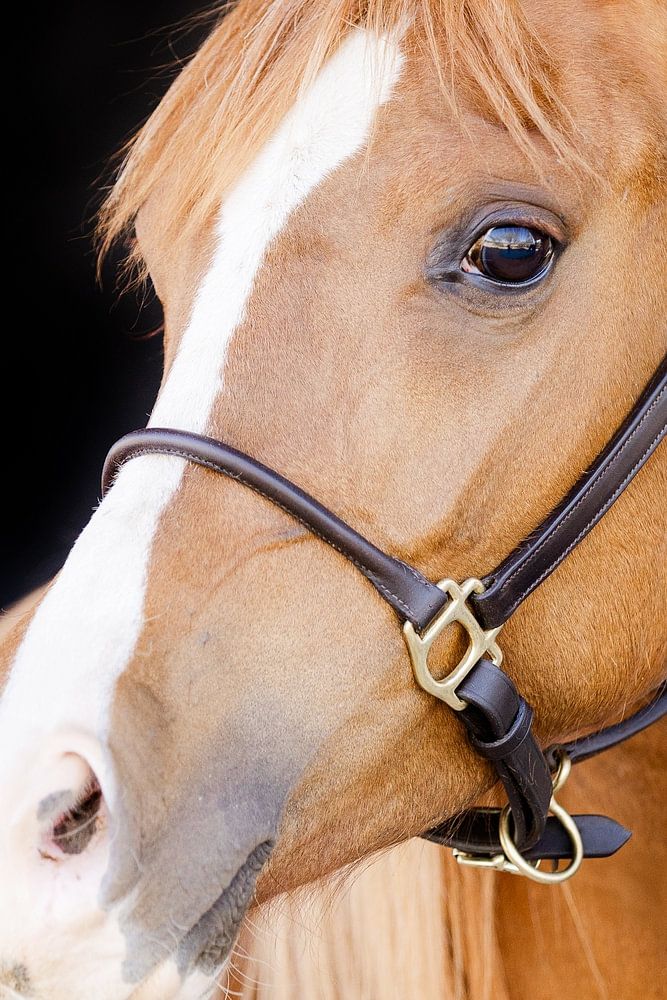 Portrait d'art d'une jeune jument arabe. Photographiée sur un fond noir intemporel.