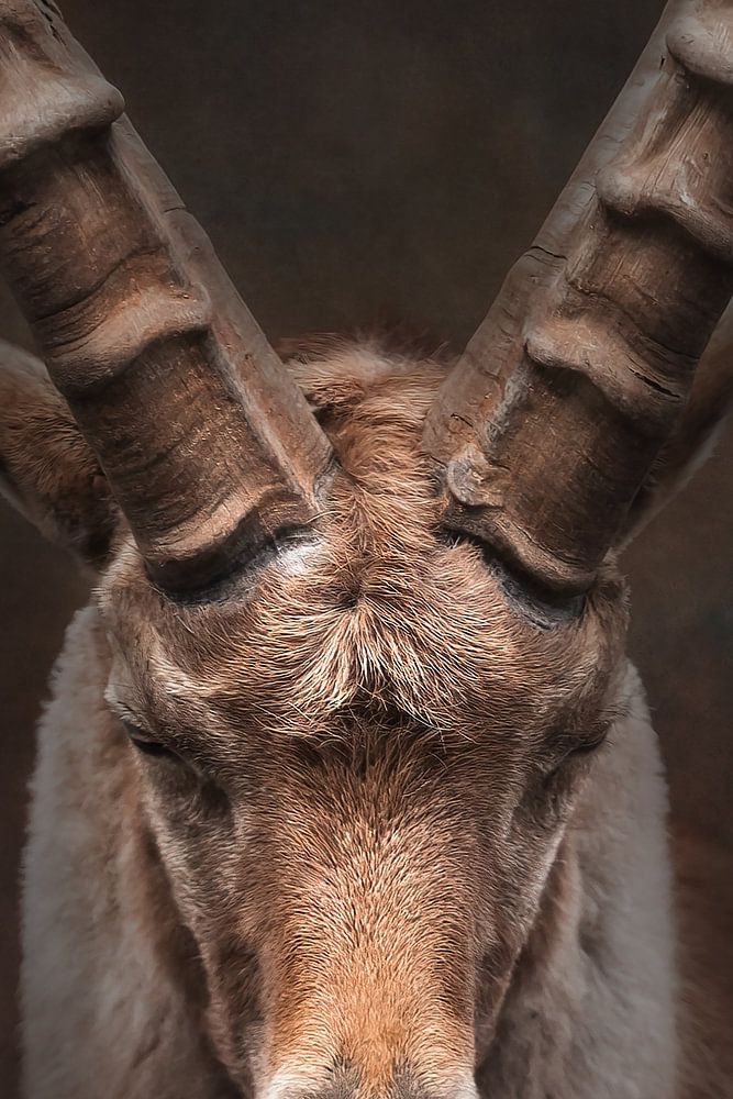 Ses couleurs sont profondes et chaudes. Le brun foncé et les tons terreux dominent, avec des reflets subtils qui accentuent la texture de la fourrure et la courbure des cornes. L'arrière-plan est doux et diffus, ce qui détache encore davantage le bouquetin de son environnement. Cela donne à l'œuvre un aspect presque pictural.