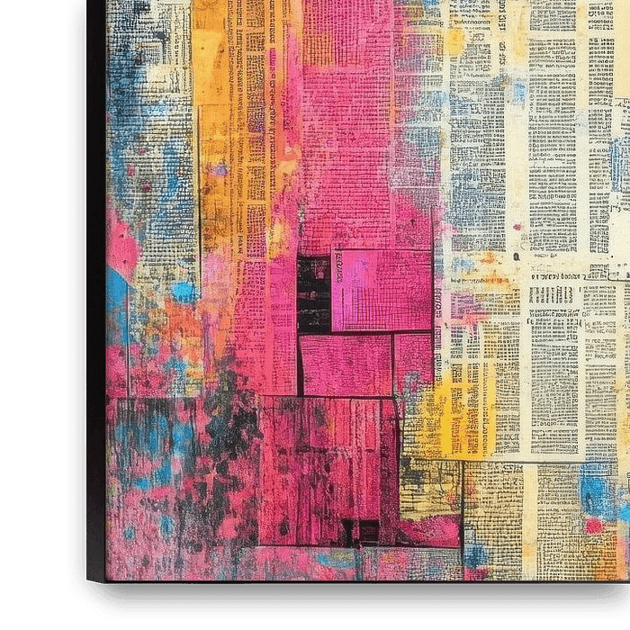 Portrait d'une belle jeune femme portant un chapeau. Son visage a été rendu flou, laissant les détails imprécis. Cela confère à l'œuvre un caractère mystérieux et abstrait, invitant le spectateur à interpréter lui-même ce qui se cache derrière. Collage mixte combinant des techniques de peinture et des coupures de journaux. Cette œuvre d'art s'intègre bien dans un style de vie éclectique ou moderne. Couleurs : rose, bleu, jaune, noir.