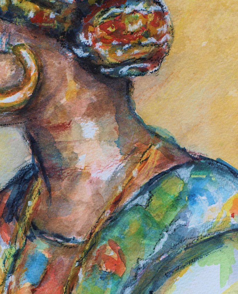 Aquarelle d'une femme gambienne portant de grandes boucles d'oreilles en or. Les grandes boucles d'oreilles en or sont caractéristiques de la tribu des Peuls en Gambie. Plus elles sont grandes, plus la personne est riche. Elle porte un kaftan de différentes couleurs, des couleurs que l'on retrouve également dans son foulard.