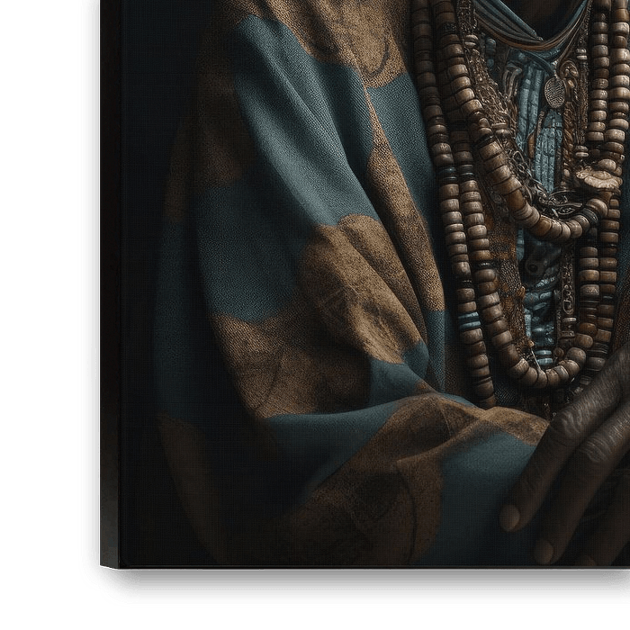 Portrait d'une femme africaine. Cette œuvre fait partie de la série "Tribus", voir l'album dans ma boutique pour d'autres portraits. Vous voyez une femme africaine déjà âgée, vêtue de vêtements traditionnels et portant des bijoux authentiques. Une belle œuvre pour votre mur ! Cette œuvre est produite numériquement. Elle peut ressembler à une photographie, mais ce n'est pas le cas. Il s'agit d'une combinaison de mon imagination, de l'intelligence artificielle et de Photoshop. Si vous achetez cette œuvre, vous aurez vraiment quelque chose de spécial sur votre mur.