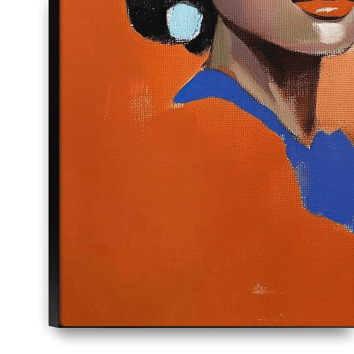 Ce tableau est un portrait moderne et saisissant, dont la palette de couleurs dynamiques attire immédiatement l'attention. L'image montre une femme au regard serein et confiant. Le fond orange vif encadre parfaitement le visage et accentue les tons subtils de sa peau. Ses yeux, d'un vert profond, sont particulièrement expressifs et…