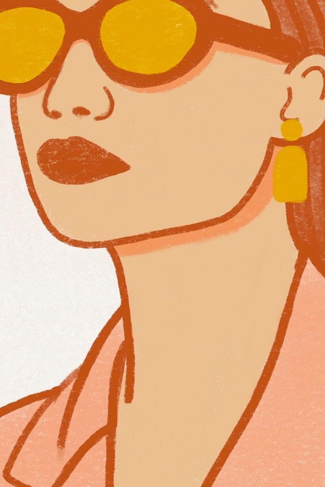 Illustration abstraite minimaliste d'une femme portant de grandes lunettes de soleil et des boucles d'oreilles. Les couleurs jaune et rouge/rose donnent un aspect joyeux et estival. Le fond est blanc cassé avec une texture subtile. Ce portrait ajoute une touche ludique et minimaliste à votre intérieur !