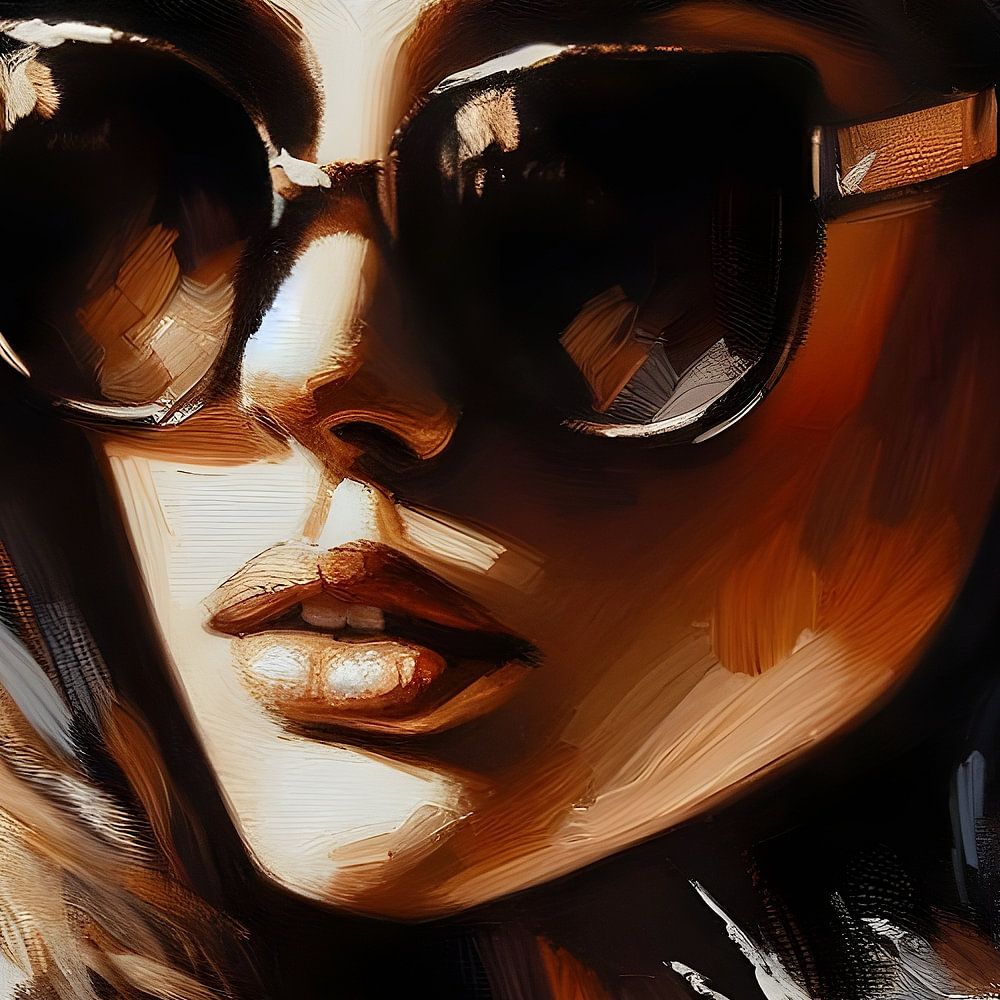 Découvrez l'intrigant portrait d'une femme portant des lunettes de soleil, enveloppée dans de riches nuances de brun et d'or. Cette œuvre, avec ses coups de pinceau magistraux et son jeu subtil d'ombre et de lumière, dégage un air de mystère et de sophistication. Les détails soigneusement capturés et les ombres expressives confèrent au portrait un caractère profond et significatif. Laissez l'ambiance chaleureuse et luxueuse de cette œuvre enrichir votre espace d'une touche d'élégance et de style intemporels.