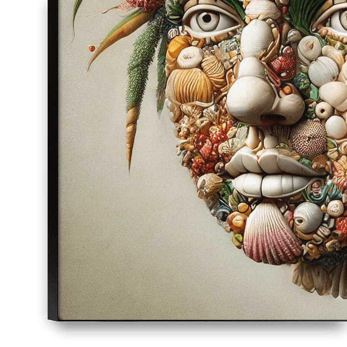 Apportez une touche d'histoire de l'art et de beauté surréaliste à votre intérieur avec ce portrait unique. Cette œuvre d'art est une composition intrigante d'étoiles de mer, de coquillages et d'éléments naturels qui, ensemble, forment un visage humain.