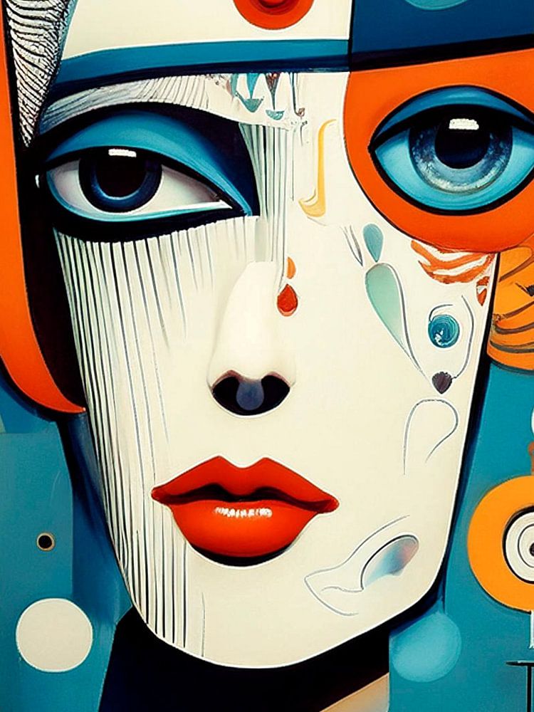 Le portrait de Turgo montre une femme dans une image vigoureuse et stylisée qui semble s'inspirer de l'art abstrait du 20e siècle. Le visage de la femme est asymétrique et décomposé en formes géométriques, ce qui rappelle le style du cubisme ou du surréalisme. Son œil droit est grand et représenté de manière hyperréaliste dans un bleu vif, mis en valeur par un cercle orange et des lignes noires. Son œil gauche, au contraire, semble presque abstrait, avec une ligne de cils allongée. Sa tête est recouverte d'une structure complexe composée de formes jaunes, bleues et blanches, ainsi que de fines lignes parallèles qui donnent de la texture aux cheveux. Le fond est d'un bleu turquoise vif, rempli de cercles et de demi-cercles orange, blancs et noirs qui ressemblent à des planètes flottantes ou à des symboles abstraits. Ces éléments créent une atmosphère dynamique et pleine d'énergie. Le choix des couleurs - en particulier l'interaction entre le turquoise, l'orange et le jaune - est très audacieux et expressif. Le cou de la femme est orné d'un motif voyant à rayures rouges et blanches, qui rappelle un thème maritime et crée un contraste surprenant avec les autres éléments. Dans l'ensemble, l'image est une représentation puissante et ludique, un mélange fascinant de rigueur géométrique et de palette de couleurs vives.
