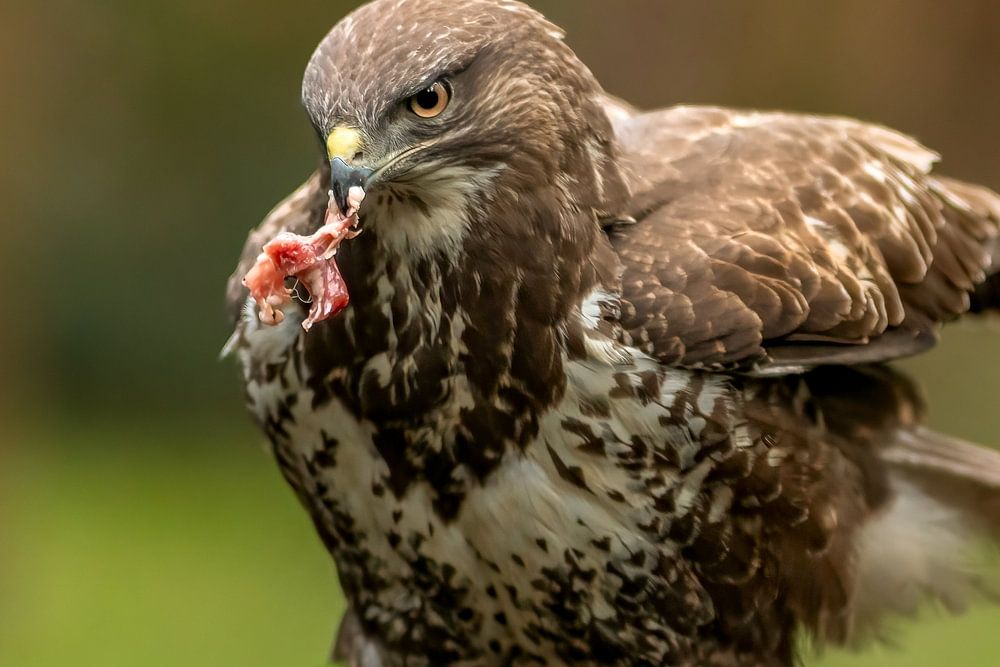 La buse tient sa proie dans son bec. Un beau portrait de la nature telle qu'elle est. Photographiée dans une forêt, la buse est au sol en train de manger sa proie. Les yeux de l'oiseau de proie se révèlent être d'une grande acuité.