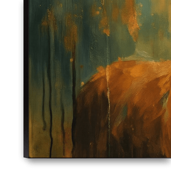 Un cerf royal aux bois imposants occupe le devant de la scène, construit à partir de larges coups de pinceau et de subtiles coulures de peinture. L'arrière-plan mêle la sarcelle froide à des tons chauds d'ocre et d'or, créant ainsi de la profondeur et du contraste. Le portrait net de l'animal et les textures organiques donnent un aspect…