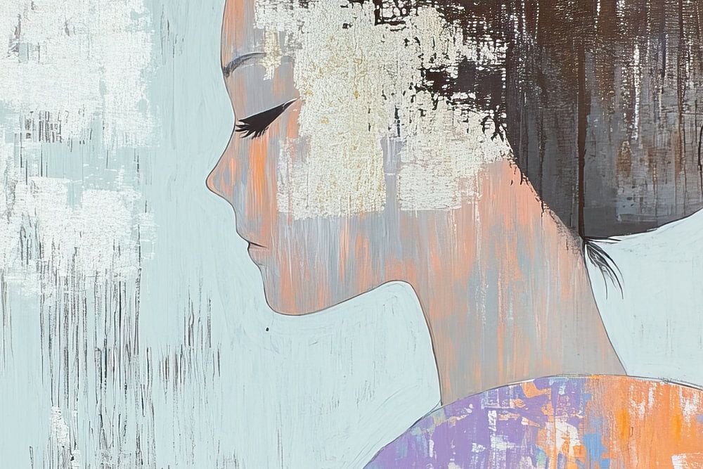 Portrait de femme | Silent City Soul - Cette peinture de femme montre un profil de femme au regard discret, sur un fond de motifs abstraits et superposés dans des tons de blanc, de gris et d'orange, reflétant la dureté d'un environnement industriel urbain.