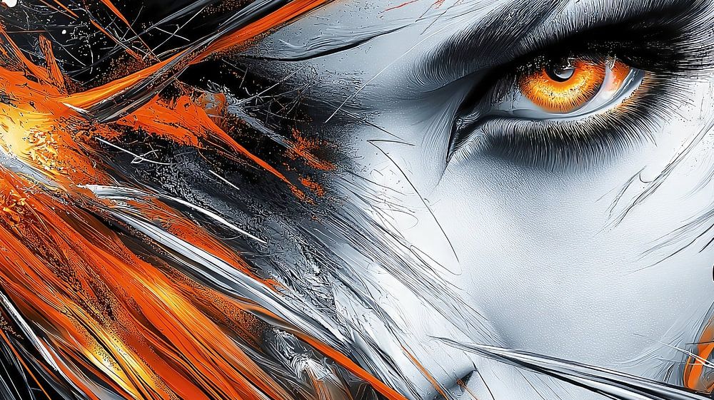 Cette impressionnante illustration abstraite montre le visage d'une femme qui émerge de coups de pinceau vifs orange et blancs sur un fond noir. Les couleurs dynamiques et les lignes dégagées créent une composition captivante qui fascine le spectateur. Les contrastes entre les tons chauds et le noir profond confèrent à l'image profondeur et intensité, tandis que le visage féminin prend des traits doux qui s'épanouissent dans le chaos des couleurs. Cette représentation combine l'art et l'émotion et donne l'impression que le visage vit dans le jeu des couleurs. C'est un exemple puissant de la façon dont l'art abstrait peut exprimer les sentiments et la beauté de manière innovante.