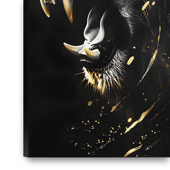 Tête de lion noir et or sur fond noir.