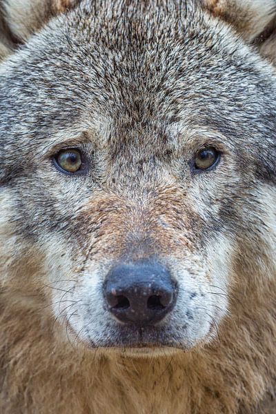 Portrait d'un loup gris, photographié dans un zoo.