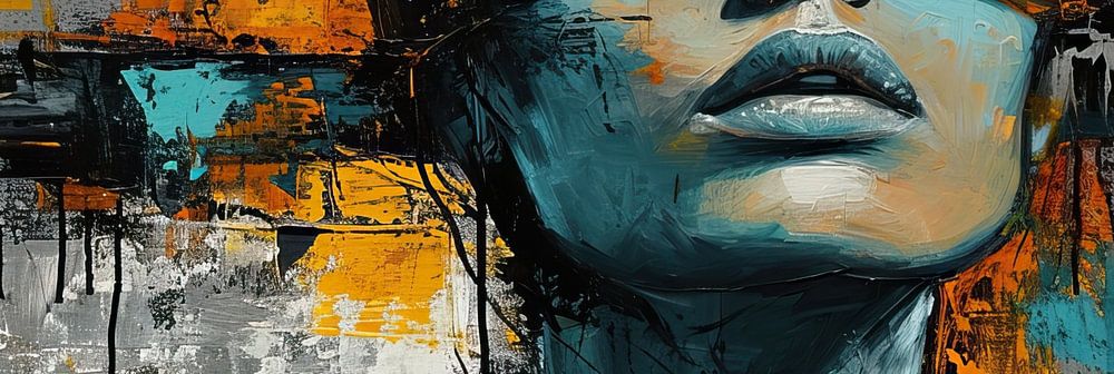 Portrait moderne - Contraste turquoise - Cette œuvre puissante joue avec l'harmonie entre l'expression abstraite et la composition figurative, le visage d'une femme émergeant presque d'une mer de coups de pinceau dynamiques et de contrastes de couleurs audacieux. Des teintes turquoise froides et orange chaudes se disputent l'attention dans une fusion de textures et de formes, donnant lieu à un spectacle intrigant qui peut orner des intérieurs contemporains et classiques. Détails : femme, visage, abstrait, moderne, turquoise, orange, gris, noir, blanc, art, Moderne Chic Couleurs : turquoise, orange, gris, noir, blanc, orange Portrait moderne