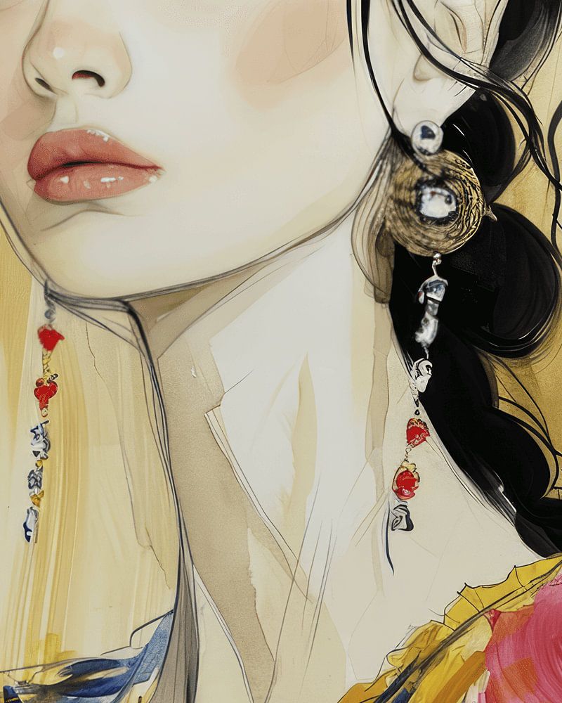 Portrait moderne. Illustration d'une jeune femme en jaune, bleu et rose. Choisissez vous-même la taille et le matériau de cet accroche-regard et adaptez-le à votre intérieur. Les illustrations sont la tendance de 2024 !