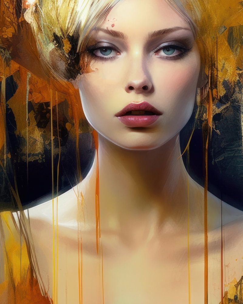 Portrait moderne avec des gouttes de peinture évasées en jaune, orange et or. Cette œuvre fait vraiment sensation !