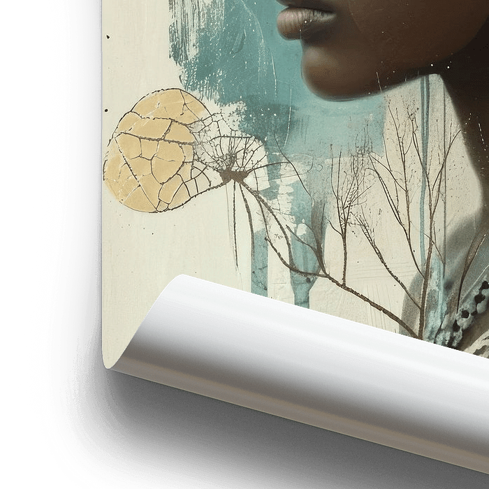 Portrait d'art numérique en techniques mixtes. Portrait moderne et abstrait d'une jeune femme africaine dans des tons de blanc, de bleu et d'or. Un accroche-regard pour votre mur !