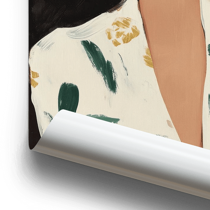 Un portrait de femme moderne et rêveur, avec un fond blush doux et un regard serein, presque méditatif. Ses longs cheveux noirs tombent le long de son visage comme une vague tranquille, tandis que les boucles d'oreilles blanches et les accents verts et dorés peints librement sur son chemisier ajoutent une touche fraîche et luxueuse. Les coups de pinceau restent visibles, ce qui donne à cette œuvre une texture chaleureuse et artisanale qui prend magnifiquement vie dans un cadre d'art accroché au mur.