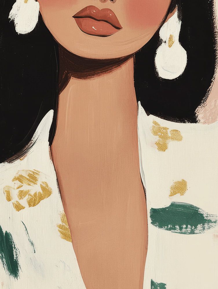 Un portrait de femme moderne et rêveur, avec un fond blush doux et un regard serein, presque méditatif. Ses longs cheveux noirs tombent le long de son visage comme une vague tranquille, tandis que les boucles d'oreilles blanches et les accents verts et dorés peints librement sur son chemisier ajoutent une touche fraîche et luxueuse. Les…