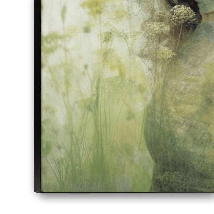 Portrait poétique en couleurs pastel mates d'une fille en vêtements bleus doux parmi les herbes à flûtes. Une belle œuvre pour votre mur, belle dans n'importe quelle taille !