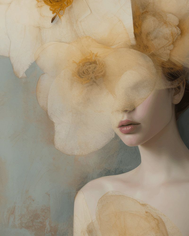 Portrait romantique avec des fleurs dans des tons doux. Choisissez la taille et le matériau sur lequel vous imprimez cet accroche-regard et adaptez-le à votre intérieur.