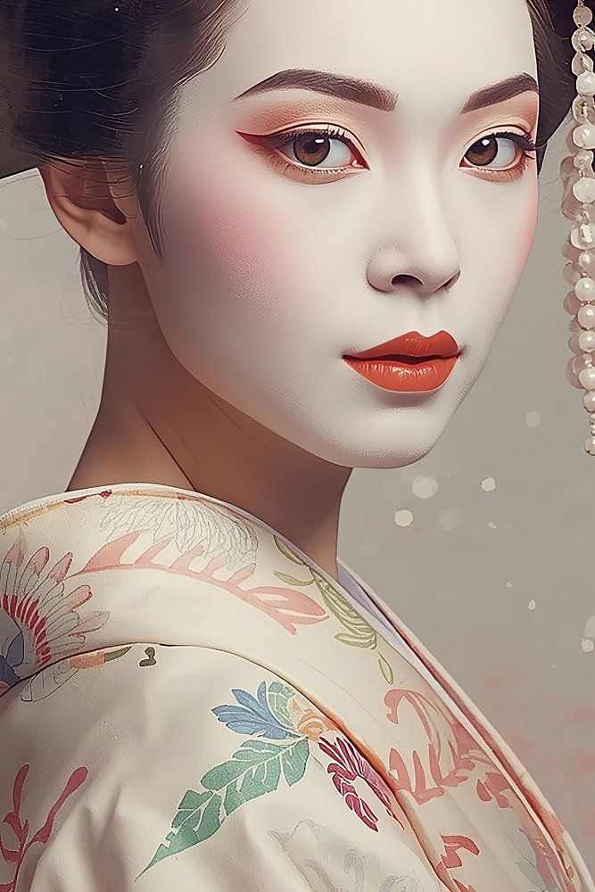 Image générée par l'IA d'une Geisha parée d'une tenue originale et de bijoux de cheveux à l'aquarelle.