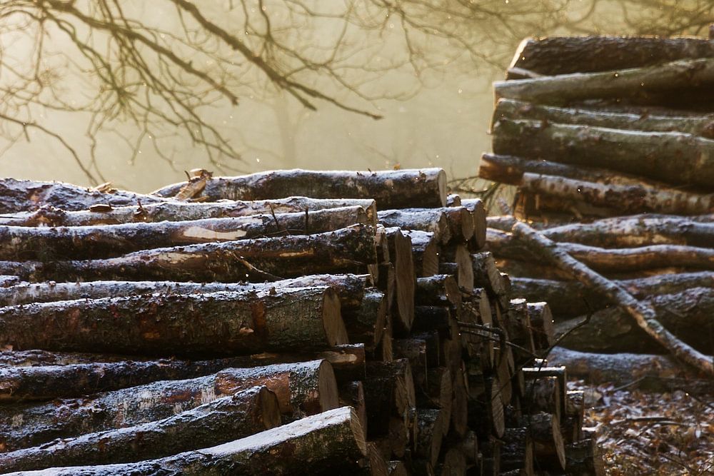 Prachtige opnamen van stammen in het bos met vorst tijdens zonsopkomst in natuurgebied de Posbank in de winter