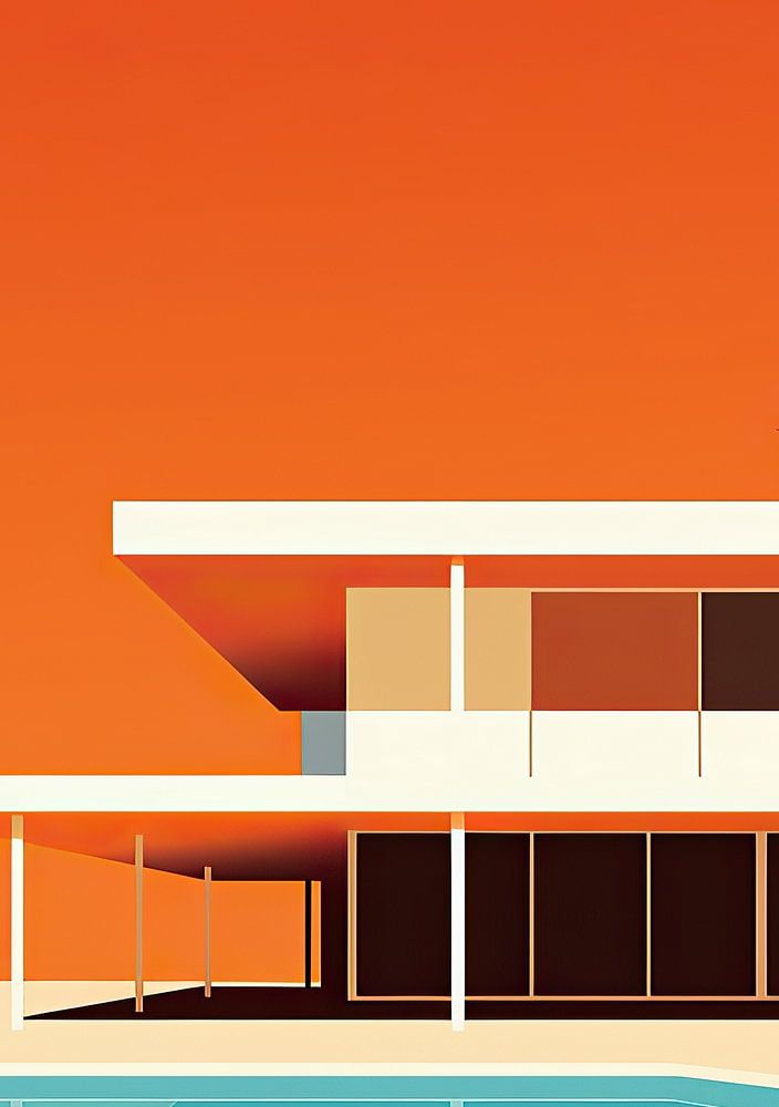 Une maison Bauhaus blanche avec une piscine devant, des graphiques vectoriels sobres dans le style minimaliste, un ciel orange vif.