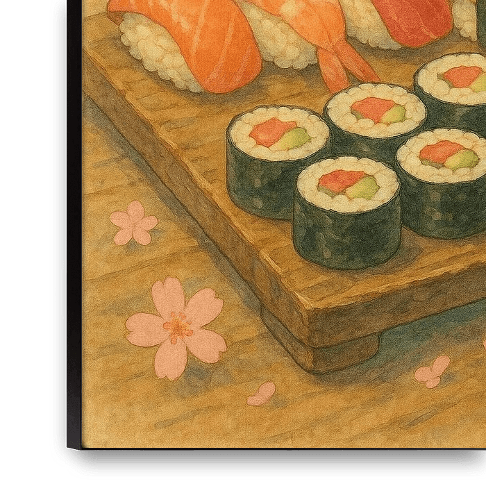 Ce poster de sushi enchanteur allie la beauté de la cuisine japonaise au charme d'une illustration à l'aquarelle de style anime. Les sushis nigiri au saumon, au thon et au tamago sont accompagnés de rouleaux de maki frais. L'œuvre est encadrée de fleurs de cerisier flottantes, évoquant l'atmosphère paisible du printemps au Japon. Les…