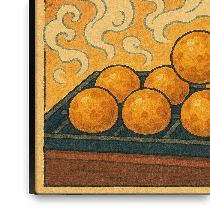 Cette affiche vibrante de Takoyaki célèbre l'en-cas de fête bien-aimé des Japonais avec le charme d'une aquarelle de style anime. Le dessin montre un plateau de boules de takoyaki dorées et fumantes sous des lanternes lumineuses, avec des tourbillons de fumée amusants en arrière-plan. Les tons chauds orange et beige combinés aux…