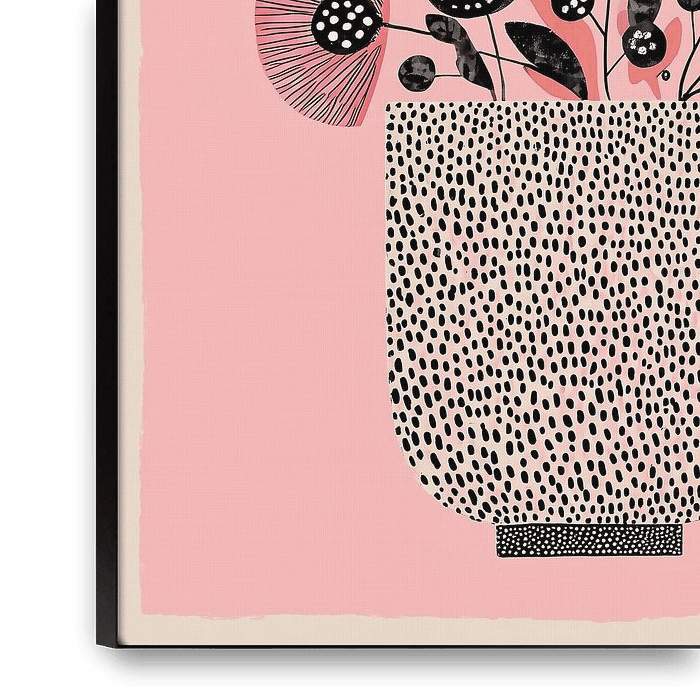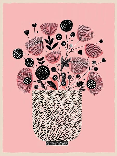 Cette œuvre représente une nature morte florale graphique aux formes puissantes et à la palette de couleurs vives. La combinaison du rouge, du rose, du bleu-gris et du noir crée une image moderne et équilibrée. Les fleurs et les feuilles stylisées confèrent à l'œuvre un caractère ludique, tandis que la composition épurée préserve le calme et la clarté.