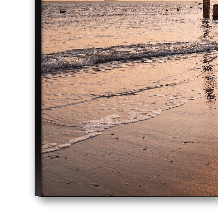 Cette photo de coucher de soleil atmosphérique de Flushing montre une rangée de poteaux de plage couverts de bernacles s'enfonçant dans la mer, avec deux grands poteaux couronnés par des mouettes au repos. La lumière chaude et dorée du soleil couchant se reflète sur le sable mouillé et l'eau calme, jetant une lueur sereine sur l'ensemble de l'image. L'action douce des vagues et les lignes minimalistes créent un équilibre harmonieux entre la tranquillité, la nature et l'architecture côtière. Une image intemporelle de la côte néerlandaise dans sa forme la plus poétique.