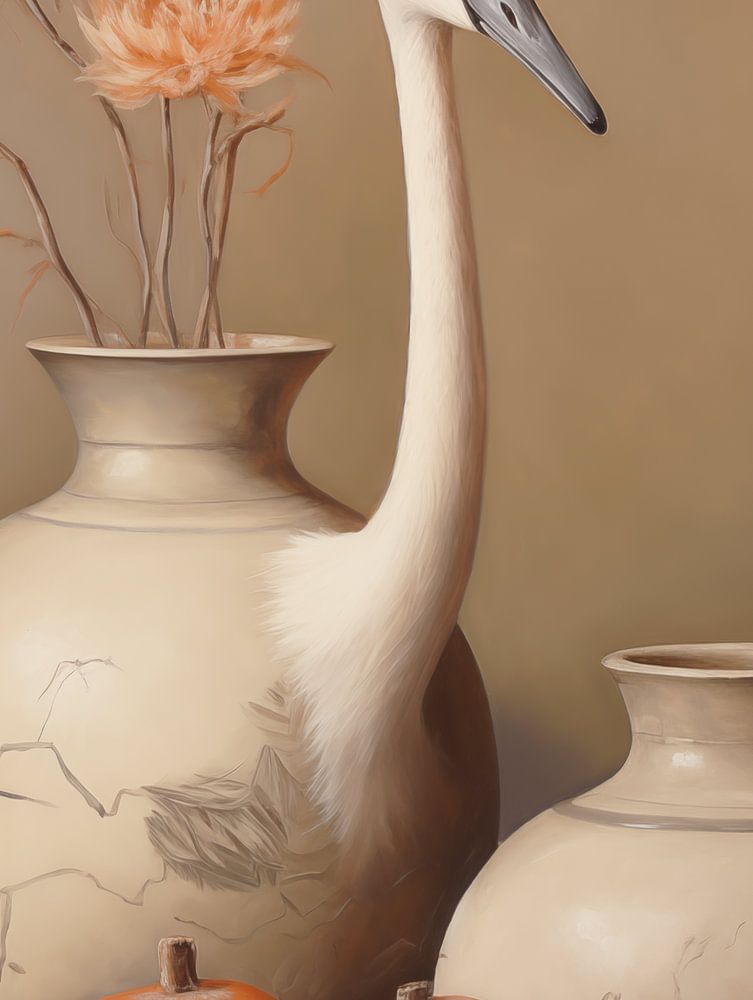 Une nature morte surréaliste d'un oiseau avec un corps en poterie.