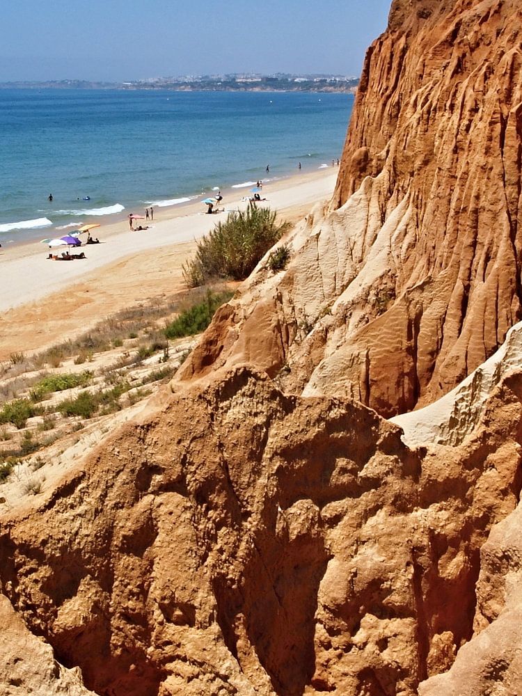 Longue plage de sable sur l'Algave près d'Albufeira. Couleurs vives de la mer et des rochers de grès rouge.