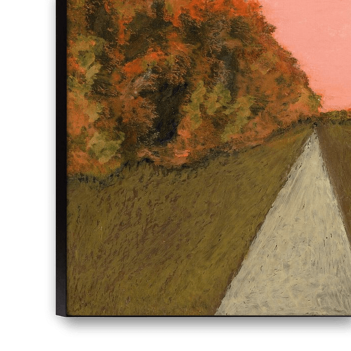 Prairie avec ciel rose et arbres orange