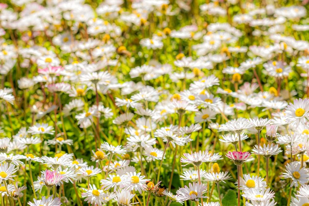 Prairie fleurie avec de nombreuses marguerites en fleurs au printemps avec une mise au point douce et un effet bokeh.
