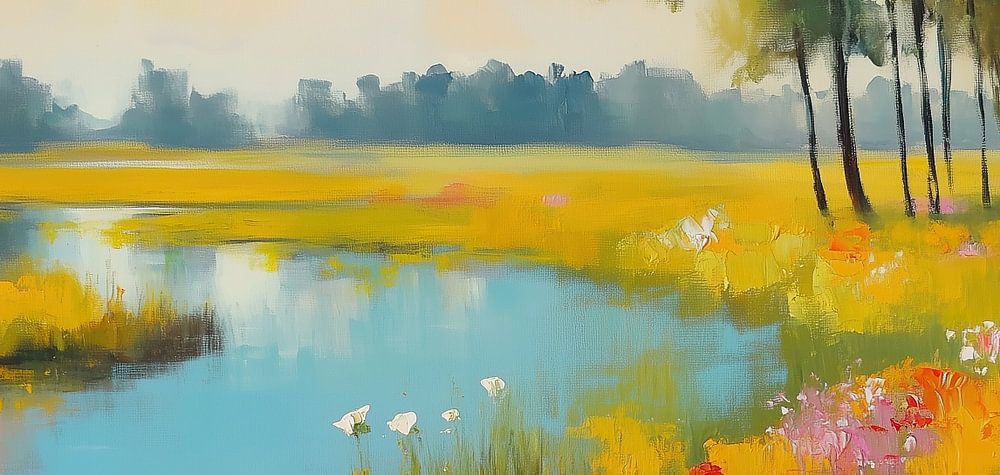 Techniek en penseelwerk zijn opvallend: lagen verf, snelle vlekken voor de bloemen, zachte overgangen in de lucht en strakkere, donkere verticale lijnen voor de bomen rechts. Het is indruk- en suggestiewerk: geen botanische tekening, maar een bloemenveld en een meer zoals herinnerd na een lange wandeling, met kleuren die zijn opgevoed tot een bijna muzikale harmonie. Het resultaat is een bloemen schilderij en een meer schilderij tegelijk — twee eenvoudige woorden die samen het hele landschap vertellen.