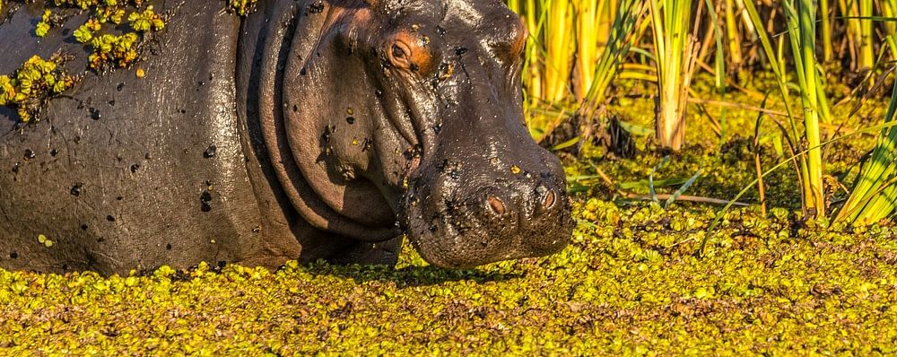L'hippopotame prend un bain d'herbes confortable et profite du soleil.