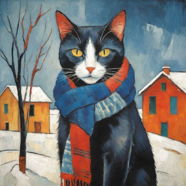 Un chat aux yeux jaunes remarquables est enveloppé dans une écharpe bleu-rouge vif. En arrière-plan, on voit un sol enneigé, des arbres dénudés et des maisons orange sous un ciel nuageux.