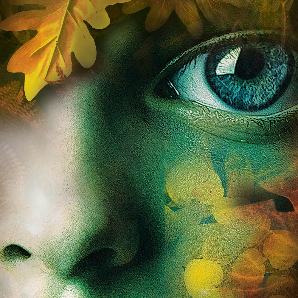 Un visage d'enfant apparaît au centre, en partie caché derrière un voile de feuilles et de fougères. La peau a une teinte verdâtre, de sorte que le visage semble presque se fondre dans l'environnement naturel. Un œil, d'un bleu vif et intense, attire immédiatement l'attention : il semble être une porte d'entrée vers une autre réalité.