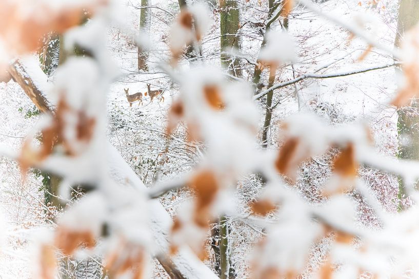 Cette photo de nature hivernale montre une scène subtile dans laquelle des chevreuils se fondent presque inaperçus dans la forêt enneigée. L'utilisation d'un premier plan flou crée de la profondeur et une expérience visuelle intime, comme si le spectateur était lui-même caché parmi les branches. Les tons doux et la composition calme donnent à l'œuvre une impression de sérénité. Cette image s'intègre parfaitement dans les espaces de vie et de travail où la tranquillité, la nature et la sophistication se côtoient. L'image invite à une observation attentive et reste donc captivante pendant longtemps. Disponible sous la forme d'une impression d'art de haute qualité, adaptée à une présentation murale.