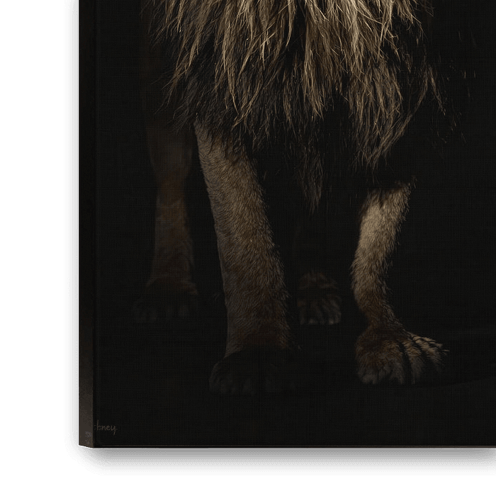 Gros plan réaliste et puissamment éclairé d'un lion mâle adulte émergeant de l'ombre profonde. L'éclairage dramatique met en valeur sa magnifique crinière et ses yeux ambrés, intenses et vigilants. Une majesté pure et indomptée.