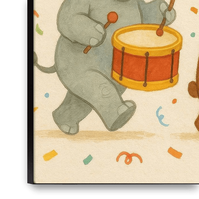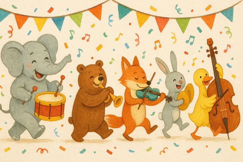Une procession d'animaux heureux défile tandis que des confettis tourbillonnent et que des guirlandes en forme d'arc remplissent l'air. De petites notes de musique dansent autour du groupe, ajoutant un rythme enjoué à la scène. Des tons pastel doux et des textures chaudes créent une atmosphère chaleureuse et accueillante. Les formes…